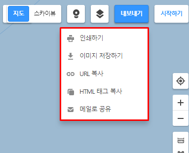 카카오맵 지도에 있는 여러기능들 중 '내보내기'를 이용하면 지도를 다운로드할 수 있습니다. 내보내기에는 인쇄하기 / 이미지 저장하기 / URL 복사 / HTML 태그 복사 / 메일로 공유 기능이 포함되어 있습니다. 해당 기능들 중 '이미지 저장하기'를 선택하면, 보여지고 있는 지도를 이미지 파일로 저장할 수 있습니다.