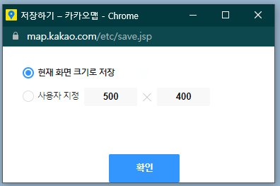 두가지 선택지 중 하나를 선태한 후, 사용자 지정의 경우 이미지 사이즈를 조절합니다. [확인] 버튼을 선택하면 지도를 다운로드 할 수 있습니다.