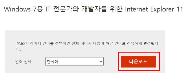 3번에서 나열된 항목에서 가장 첫번째를 선택하면 위 사진과 같은 페이지로 연결되게 됩니다. 여기서 언어를 선택한 후, [다운로드] 버튼을 이용해 인터넷 익스플로러 11 다운로드를 진행할 수 있습니다.