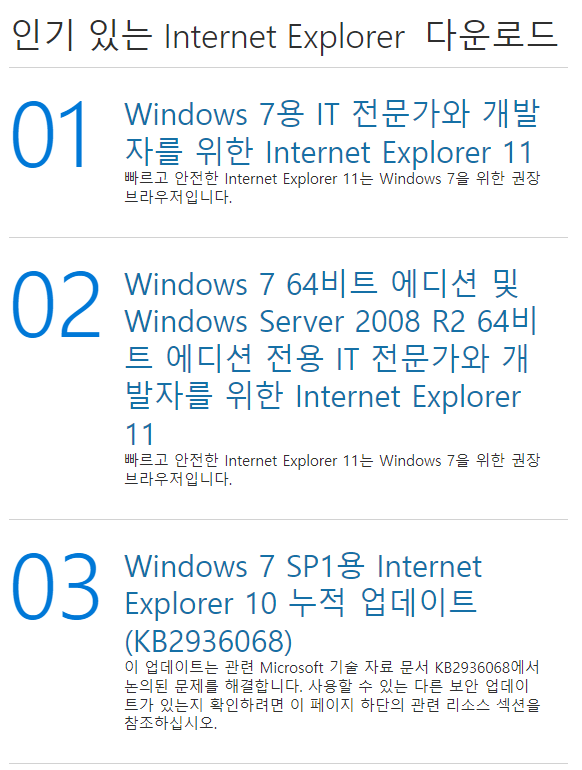 2번에서 소개한 방법을 이용하면 다양한 검색 결과(탐색) 페이지로 연결됩니다. 여기서 원하는 게시물을 선택하면 됩니다. 일반적으로 [Windows 7용 Internet Explorer 11]에 관련된 내용을 선택합니다.