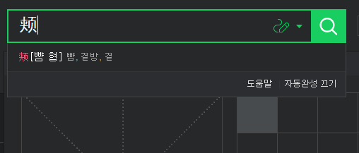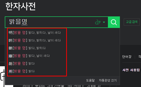 위 사진과 같이 '밝을 명'이라는 한자에 대한 연관되는 한자들이 자동완성 기능으로 나타나는 것을 알 수 있습니다. 해당 기능이 마음에 들지 않는다면 '자동완성 끄기'를 설정하면 됩니다. 개인적으로 자동완성 기능을 사용하는 것이 편리하게 느껴지는 부분이기도 합니다. 뜻과 음을 알고 있다면 해당 방법으로도 쉽게 찾을 수 있습니다.
