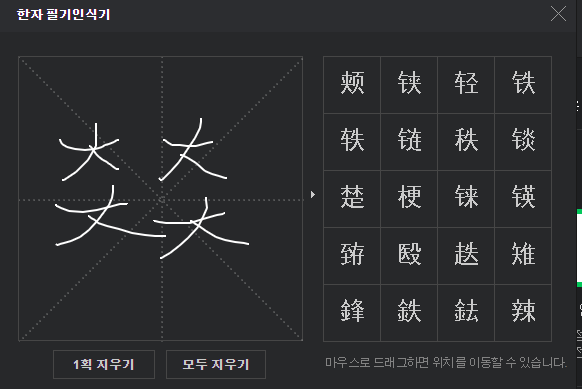 위 사진과 같이 연필모양 아이콘을 선택하면 '한자 필기인식기'라는 팝업창이 하나 뜨게 됩니다. '마우스로 한자를 쓰세요.'라고 적혀있는 부분에 원하는 한자를 그리면 됩니다. 연습삼아 아무거나 그려봅니다.