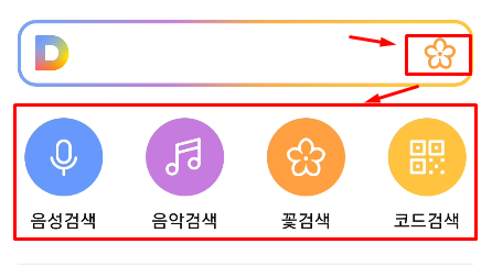 음악검색 / 음성검색 / 꽃검색 / 코드검색의 4가지 메뉴가 등장합니다. 이렇게 등장한 메뉴를 적절하게 활용해 검색자가 원하는 결과를 얻을 수 있게 도와주고 있습니다. 우리는 꽃검색을 선택하면 되겠죠.