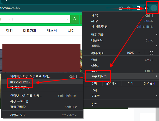 여기서는 크롬 브라우저를 이용하여 방법을 설명합니다. 먼저 크롬을 이용해 cafe.naver.com으로 접속합니다. 크롬 설정 메뉴를 선택합니다. 상단 오른쪽 점세개 아이콘입니다. 도구더보기를 클릭합니다. 바로가기만들기를 클릭합니다. 하나의 팝업창이 뜨는데요. 여기에 바로가기로 등록할 아이콘의 이름을 설정하게 됩니다. 확인을 누르면 바탕화면에서 바로가기 아이콘을 확인할 수 있습니다.