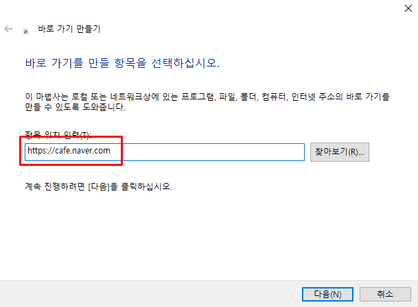 처음 과정은 바로가기 url을 입력하는 것입니다. 네이버 카페 url (cafe.naver.com)을 입력합니다.