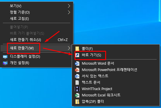 가장 대표적인 바로가기 등록 방법은 윈도우 바탕화면에서 만드는 방법입니다. 윈도우 바탕화면에서 마우스 오른쪽 버튼을 클릭합니다. '새로 만들기'를 선택합니다. '바로가기'를 선택합니다.