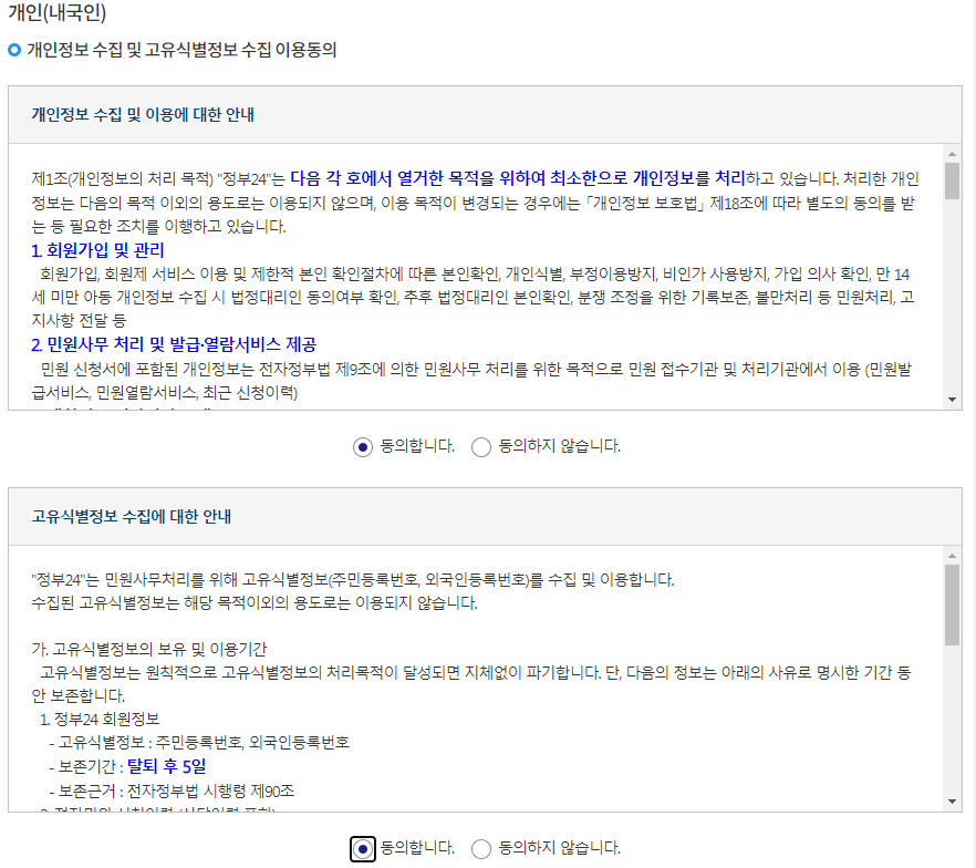 정부 24 토지대장 발급 페이지에서 [발급]버튼을 선택합니다. 개인 인증을 선택한 후, 안내되는 절차에 따라 인증을 거치게 됩니다. 별도의 회원이 아니라면 비회원 신청을 선택할 수 있습니다. 비회원 신청에서는 개인정보 수집 관련 / 고유식별정보 수집 관련 / 비회원 신청 정보 입력 사항에 대해 작성하게 됩니다.